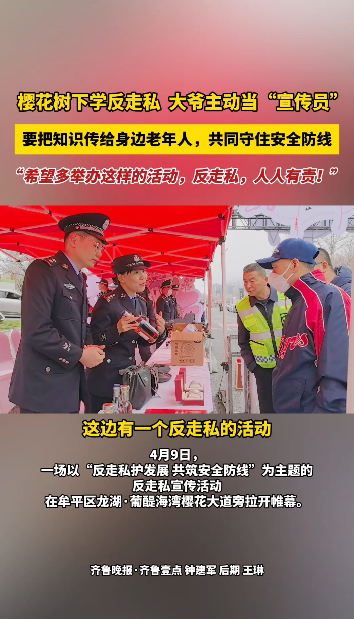 果然视频|牟平樱花树下学反走私,大爷主动当起“宣传员”齐鲁晚报·齐鲁壹点客户端 昨天22:10原创4月9日,烟台市在牟平区龙湖·葡醍海湾樱花大道旁开展了一场别开生面的反走私主题宣传活动。活动现场,一位大爷主动当“宣传员”,要把知识传给身边老年人,共同守住安全防线,“希望多举办这样的活动,反走私,人人有责!”(齐鲁晚报·齐鲁壹点 王琳 钟建军)