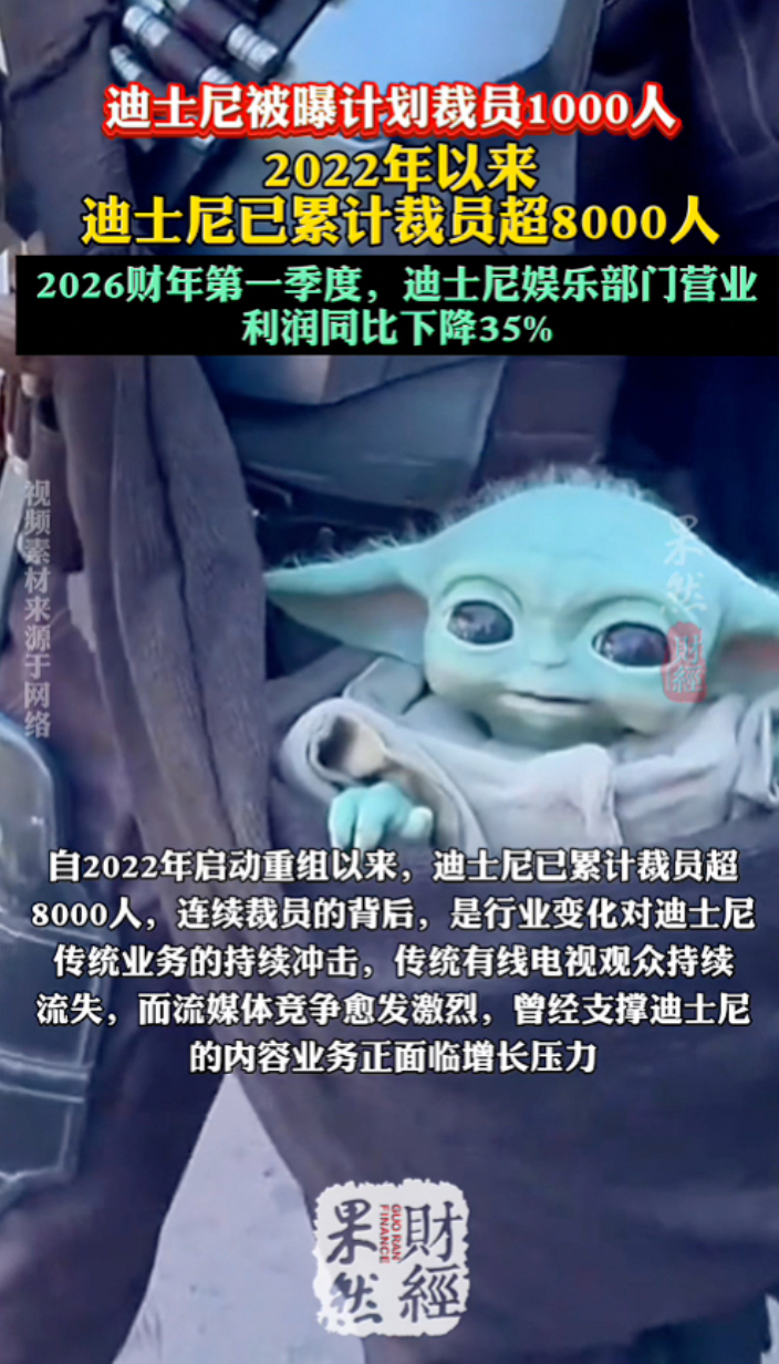 果然财经|迪士尼计划裁员千人,一季度营业利润同比下降35% 11:03 原创齐鲁晚报·齐鲁壹点客户端 微信扫码扫码下载客户端据央视财经,近日,迪士尼被曝计划在未来几周内最多裁撤1000个岗位,这也是“新掌门”达马罗上任不足一个月以来,首次传出重大组织调整的消息。据报道,此次美国华特迪士尼公司裁员计划大部分集中在市场营销部门,这是首席执行官达马罗自今年3月18日上任以来的重大举措之一,被视为他执掌公司后,为应对行业转型、优化人力结构的最新动作。