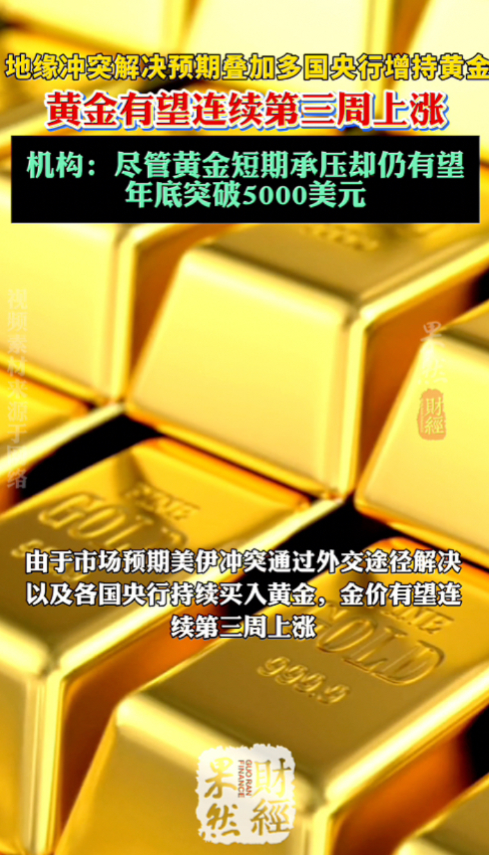 果然财经|黄金有望连续第三周上涨,年底或突破5000美元齐鲁壹点 | 11:03 原创齐鲁晚报·齐鲁壹点客户端 微信扫码扫码下载客户端由于市场预期美伊冲突通过外交途径解决,以及各国央行持续买入黄金,金价有望连续第三周上涨。据财联社,金价稳定在每盎司4750美元附近,有望实现近2%的周涨幅。然而,自2月底冲突爆发以来,黄金价格下跌了近10%,部分投资者需要弥补其他投资的损失,从而削弱了黄金的避险吸引力。
