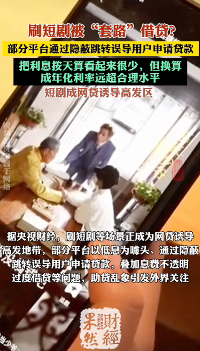 果然财经|刷短剧被“套路”借贷?换算成年化利率远超合理水平齐鲁壹点 | 11:03 原创齐鲁晚报·齐鲁壹点客户端 微信扫码扫码下载客户端“借10万(元),每个月还1500元的利息,你们要吗?我不要;借10万(元),每个月还1200元的利息,你们要吗?我不要⋯⋯”刷短剧时,你有被推送过类似这样的借贷广告吗?据央视财经,刷短剧等场景正成为网贷诱导高发地带,部分平台以低息为噱头、通过隐蔽跳转误导用户申请贷款,叠加息费不透明、过度借贷等问题,助贷乱象引发外界关注。