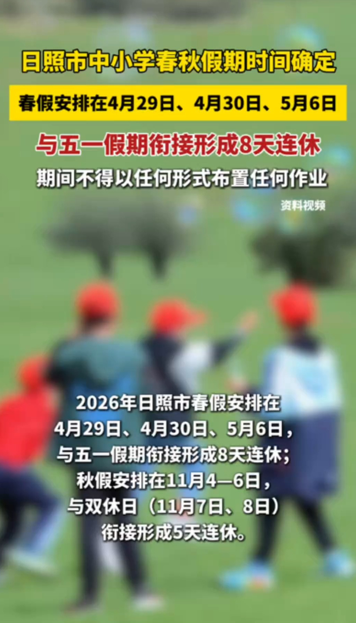 果然视频|日照中小学春秋假期确定,今年春假与五一衔接连休8天大众报业·齐鲁壹点 11:58日照市中小学春秋假期时间确定!2026年春假安排在4月29日、4月30日、5月6日,与五一假期衔接形成8天连休。