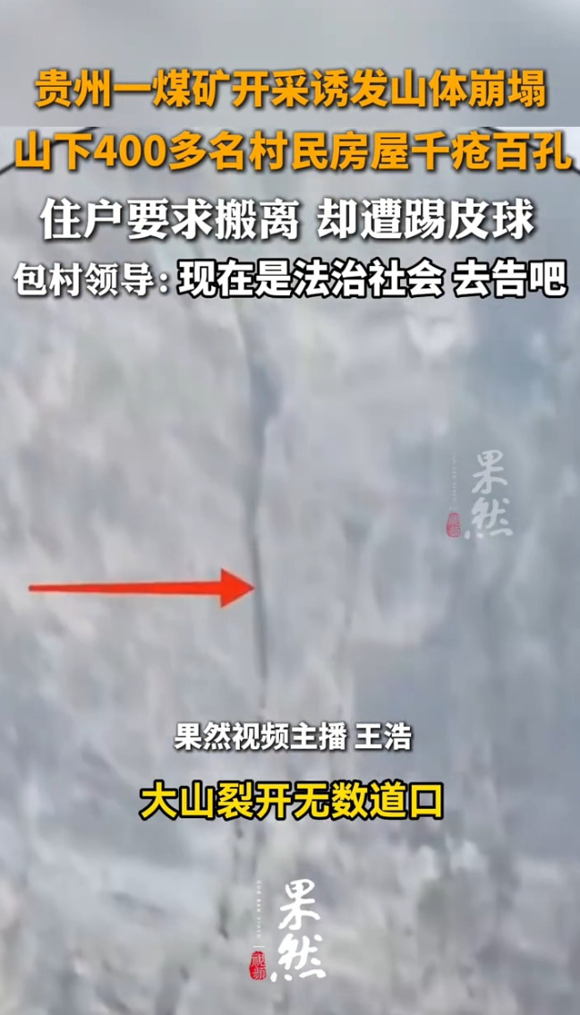 贵州一煤矿开采诱发山体崩塌,山下400多名村民房屋千疮百孔,住户要求搬离 却遭踢皮球,包村领导:现在是法治社会 去告吧