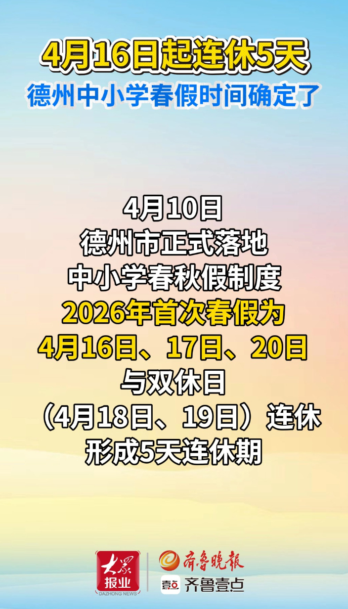 果然视频|4月16日起连休5天!德州中小学春假时间公布齐鲁晚报·齐鲁壹点客户端 昨天23:04原创4月10日,德州市正式落地中小学春秋假制度。2026年首次春假为4月16日、17日、20日,与双休日(4月18日、19日)连休,形成5天连休期。(齐鲁晚报·齐鲁壹点 马雪平)