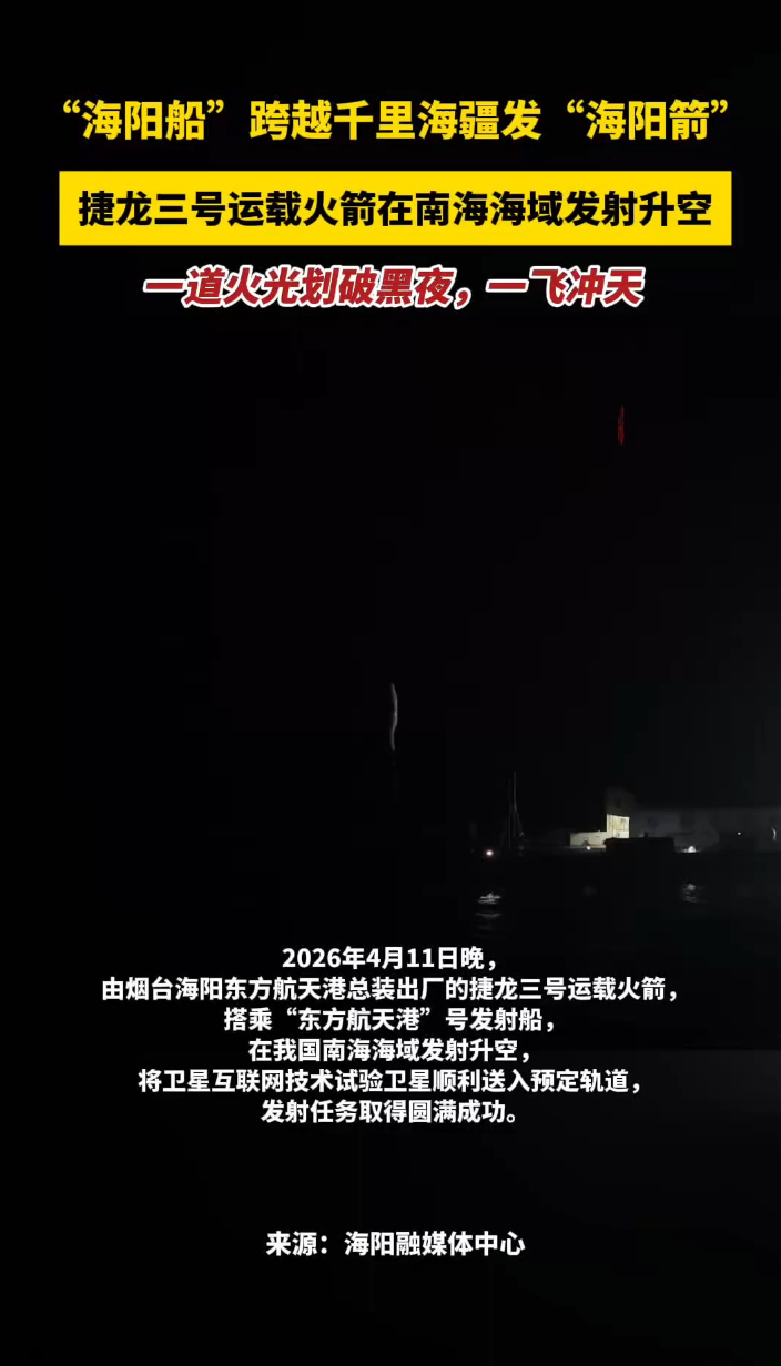 果然视频|火光划破黑夜!捷龙三号运载火箭在南海海域发射升空齐鲁晚报·齐鲁壹点客户端 08:53原创“海阳船”跨越千里海疆发“海阳箭”,4月11日晚,捷龙三号运载火箭在南海海域发射升空,一道火光划破黑夜,一飞冲天。 (齐鲁晚报·齐鲁壹点 王琳)