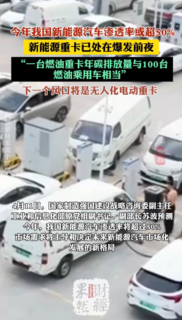 果然财经| 今年我国新能源汽车渗透率或超50% 13:44 原创齐鲁晚报·齐鲁壹点客户端 微信扫码扫码下载客户端4月11日,国家制造强国建设战略咨询委副主任,工业和信息化部原党组副书记、副部长苏波预测,今年,我国新能源汽车渗透率将超过50%,市场需求将主导和决定未来新能源汽车市场化发展的新格局。