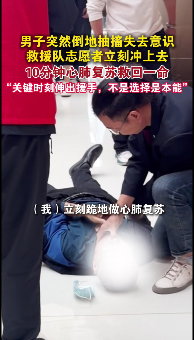 不是选择,是本性!宁津救援队志愿者跪地10分钟救回一命大众新闻 | 14:57 现场大众新闻 微信扫码扫码下载客户端4月11日,宁津县一家具展会上,一名男子突然倒地抽搐,失去意识。现场工作人员、蓝天救援队志愿者胡建兴见状立刻冲上前,跪地对其进行10分钟心肺复苏,男子逐渐恢复意识,随后被送往医院。胡建兴说:“关键时刻伸出援手,不是选择,是本性。”(大众新闻记者 贺莹莹 通讯员 苗欣 孟娟)