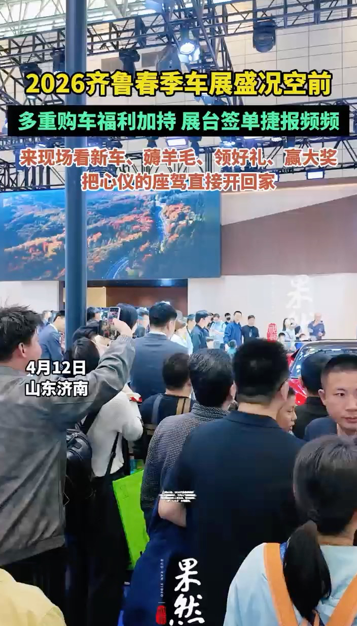 果然视频|展台签单捷报频频,齐鲁春季车展盛况空前!齐鲁晚报·齐鲁壹点客户端 15:37原创4月12日,2026齐鲁春季车展迈入开展第四天,现场人气持续走高,。四大展馆内外人潮涌动、客流如织,上演“人从众”火爆盛况。政策补贴、厂家直降、车展专属福利三重叠加,多重购车福利加持,现场展台签单捷报频频。4月9日-13日,快来山东国际会展中心看新车、薅羊毛、领好礼、赢大奖,把心仪的座驾开回家! 齐鲁晚报·齐鲁壹点 寇文奇 胡晓雪 刁明杰 李英豪