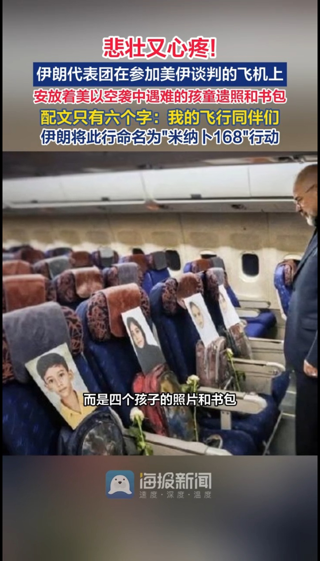 主播说丨在伊朗代表团参加美伊谈判的飞机上,第一排座位安放着美以空袭中遇难的孩童遗照和书包