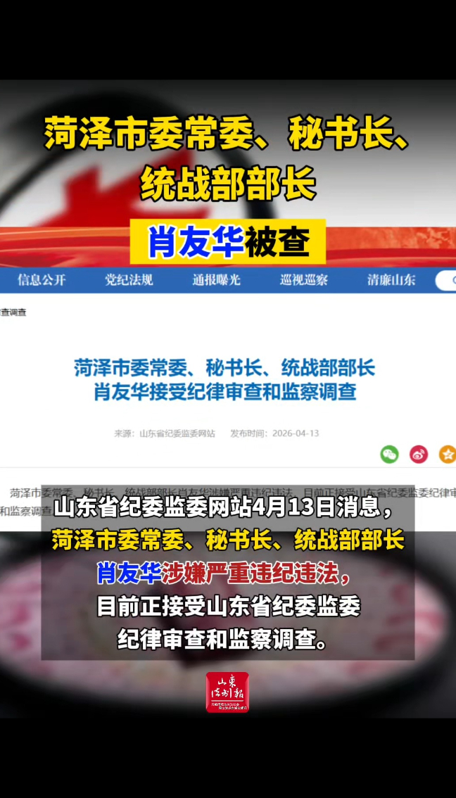 菏泽市委常委、秘书长、统战部部长肖友华被查 17:15 现场大众新闻·山东法制报 微信扫码扫码下载客户端山东省纪委监委网站4月13日消息,菏泽市委常委、秘书长、统战部部长肖友华涉嫌严重违纪违法,目前正接受山东省纪委监委纪律审查和监察调查。