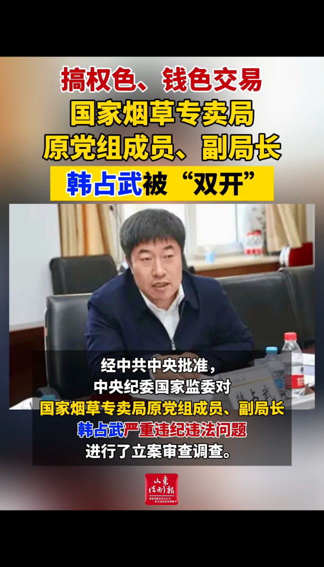 搞权色、钱色交易 国家烟草专卖局原党组成员、副局长韩占武被“双开”