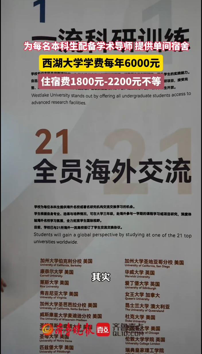 西湖大学每名本科生拥有博导,住单人间宿舍,学费6000元齐鲁晚报·齐鲁壹点客户端 11:49原创为每名本科生之前配备一名学术导师,提供像家一样舒适的单间宿舍,到了大三全员都可前往还在交流……在西湖大学,拥有如此高配置的师资和待遇,学费贵吗?4月12日,在西湖大学本科招生青岛宣讲会上,该校本科招生办负责人徐勤荣进行了解读。 (齐鲁晚报·齐鲁壹点 李珍梅)