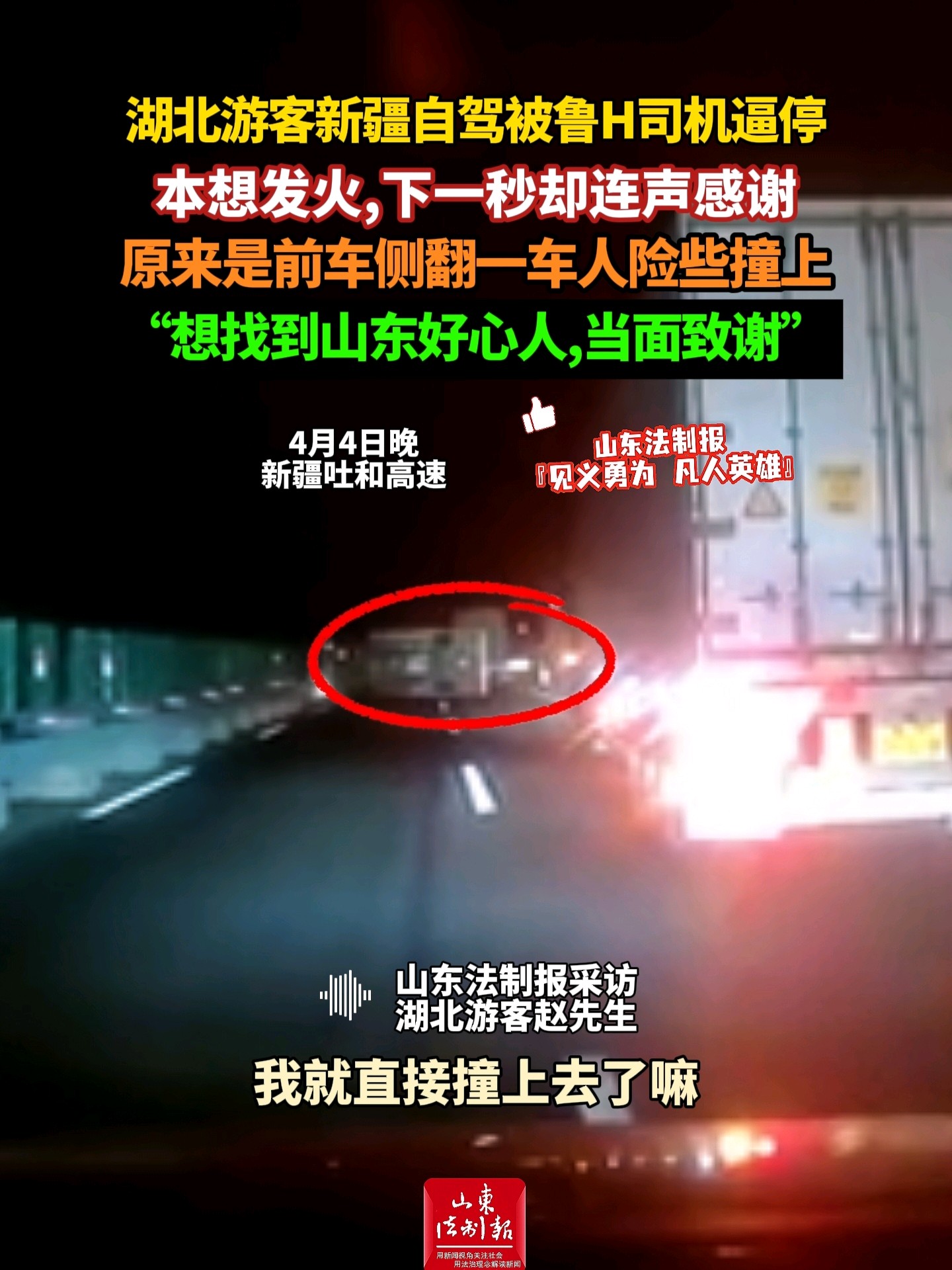 4月4日晚,新疆吐和高速吐鲁番路段,湖北的赵先生载着一家人自驾出游。他准备提速超车时,右前方一辆鲁H牌照大货车突然闪灯变道,将他逼停在行车道上。起初赵先生又气又懵,可下一秒,货车让开后,他看到前方超车道上横躺着一辆侧翻货车,顿时明白是这位鲁H司机救了他一家。赵先生在接受本报记者采访时说:“想找到这位山东好心人,当面致谢。”