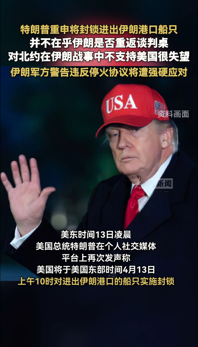 特朗普重申将封锁进出伊朗港口船只,并不在乎伊朗是否重返谈判桌大众新闻 14:31原创特朗普重申将封锁进出伊朗港口船只,并不在乎伊朗是否重返谈判桌,对北约在伊朗战事中不支持美国很失望。伊朗军方警告违反停火协议将遭强硬应对。(大众新闻编辑 李蕾)
