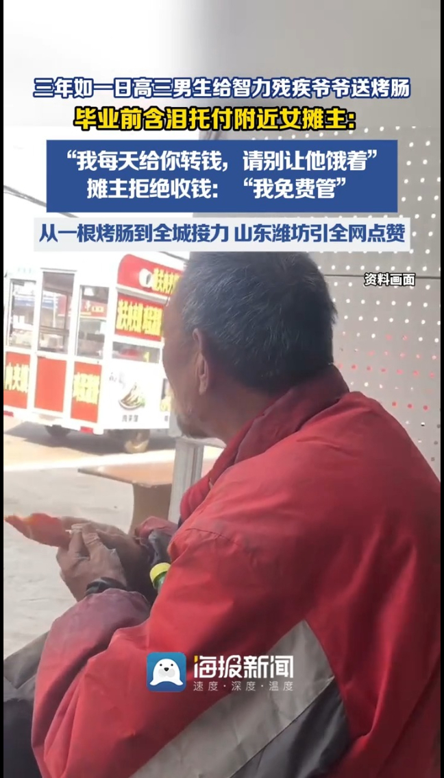 “我每天给你转烤肠钱,麻烦送给老爷爷,我怕我毕业走了,他会挨饿。”在山东潍坊,一高三男生,三年每天买根烤肠送给校门口智力残疾的老爷爷。毕业前,他含泪托付烤肠摊主,恳请她接力。三年了,一千多个日夜,这份无声的善意,没有张扬,没有合影,甚至没有人知道他在做这件事。直到毕业在即,他不得不离开,才被人知晓。