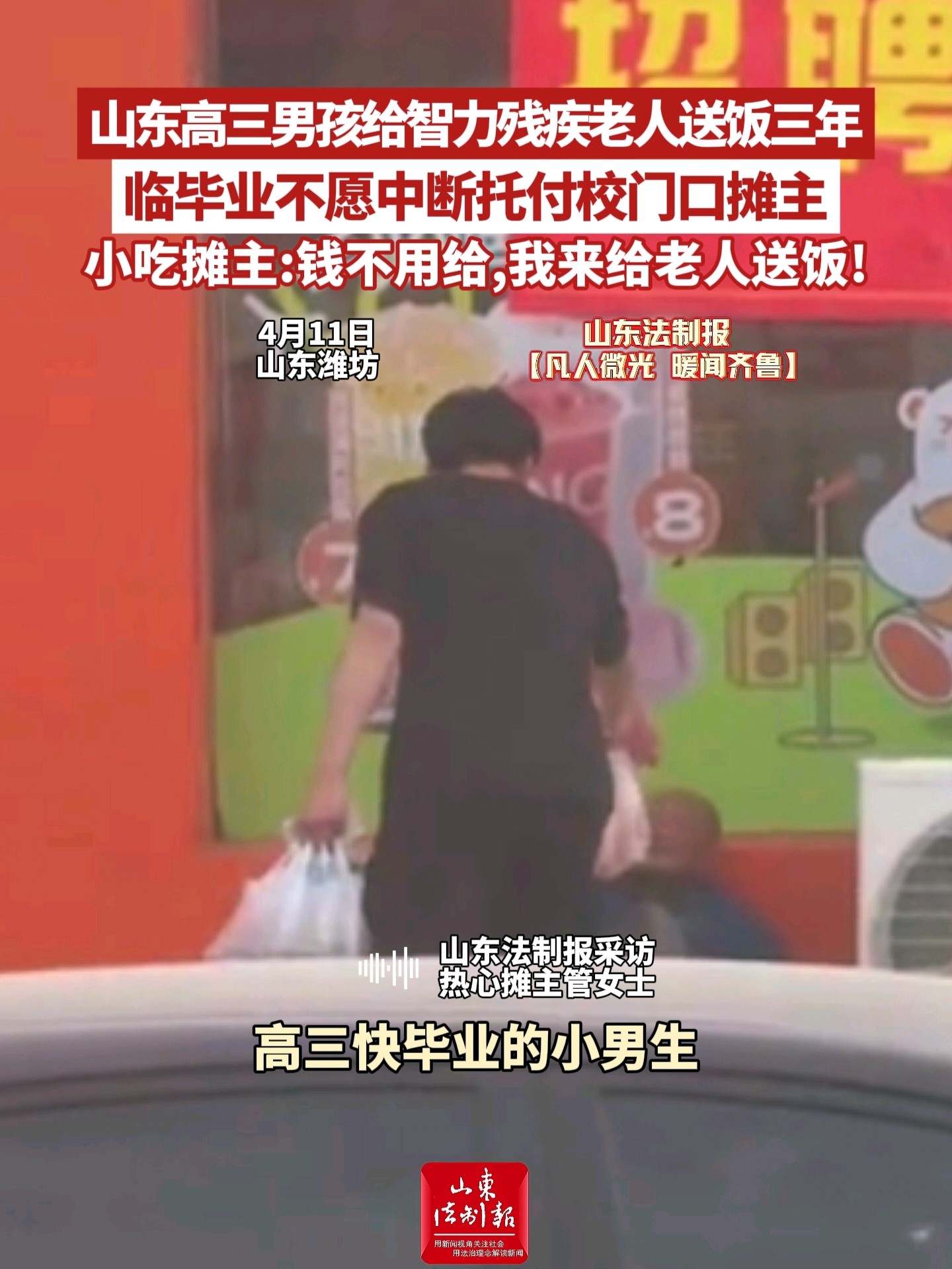 山东高三男孩给智力残疾老人送饭三年,临毕业不愿中断托付校门口摊主,小吃摊主:钱不用给,我来给老人送饭! 17:12 原创山东法制报 微信扫码扫码下载客户端4月11日,山东潍坊一名高三学生刘同学找到校门口小吃摊主管女士,希望添加微信。原来刘同学已连续三年,为附近一位智力残疾老人送食物。临近毕业,他担心老人以后无人照料。管女士深受感动,表示会接力这份善意。(大众新闻·山东法制报记者 羊文智)