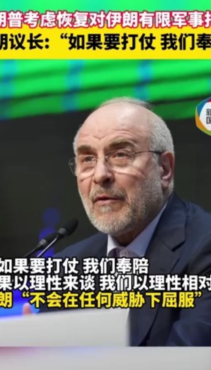 特朗普考虑继续打,伊朗议长:“奉陪”新华社 16:41据美国《华尔街日报》12日报道,在美国和伊朗谈判未能达成协议后,美国总统特朗普正考虑在封锁霍尔木兹海峡的同时恢复对伊朗的有限军事打击。伊朗伊斯兰议会议长卡利巴夫在巴基斯坦伊斯兰堡谈判返程时喊话特朗普,“如果要打仗,我们奉陪;如果以理性来谈,我们以理性相对”,伊朗“不会在任何威胁下屈服”。 (新华社)