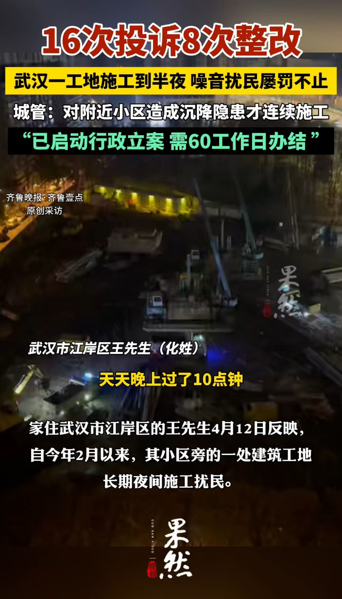 果然视频|16次投诉8次整改,武汉一工地噪音扰民屡罚不止齐鲁晚报·齐鲁壹点客户端 16:48原创家住武汉市江岸区的王先生4月12日反映,自今年2月以来,其小区旁的一处建筑工地长期夜间施工扰民。尽管他通过12345热线投诉16次,城管部门8次对施工单位下达整改通知,但夜间施工仍难停止。而针对市民的疑问,江岸区城市管理执法局回应有些“烧脑”:工地施工导致沉降隐患,所以必须连续进行混凝土浇筑,这一施工过程一旦开始很难中止,因此经常超时赶工。(齐鲁晚报·齐鲁壹点记者 胡玲玲 杜嘉文)