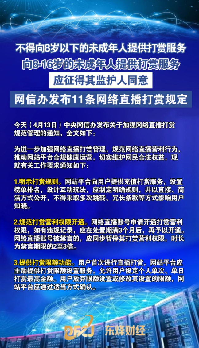 东烽财经丨不得向8岁以下的未成年人提供打赏服务,网信办发布11条网络直播打赏规定 21:38 原创大众新闻·黄三角早报 微信扫码扫码下载客户端东烽财经丨不得向8岁以下的未成年人提供打赏服务,向8-16岁的未成年人提供打赏服务,应征得其监护人同意,网信办发布11条网络直播打赏规定今天(4月13日)中央网信办发布关于加强网络直播打赏规范管理的通知。(大众新闻记者 姚会英)