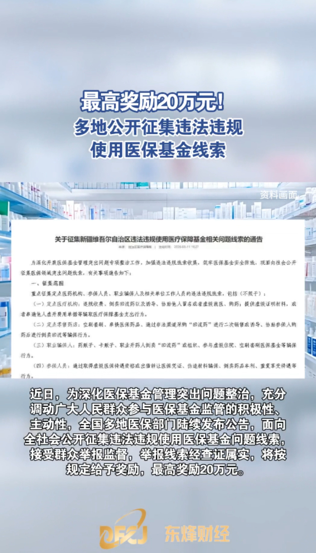 东烽财经丨最高奖励20万元!多地公开征集违法违规使用医保基金线索 21:38 原创大众新闻·黄三角早报 微信扫码扫码下载客户端近日,为深化医保基金管理突出问题整治,充分调动广大人民群众参与医保基金监管的积极性、主动性,全国多地医保部门陆续发布公告,面向全社会公开征集违法违规使用医保基金问题线索,接受群众举报监督,举报线索经查证属实,将按规定给予奖励,最高奖励20万元。(大众新闻记者 姚会英)