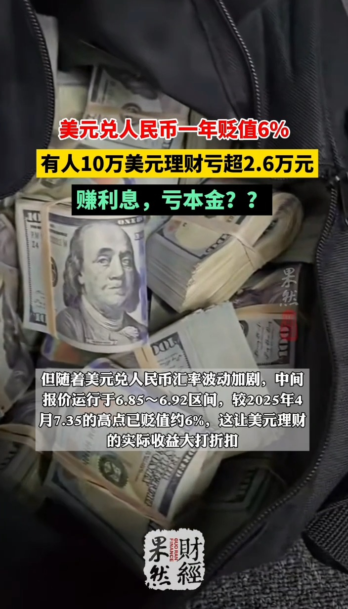 果然财经|美元兑人民币贬值,有人10万美元理财亏超2.6万元 18:08 原创齐鲁晚报·齐鲁壹点客户端 微信扫码扫码下载客户端当前境内美元理财名义收益率虽仍处于3.35%~4.46%区间,较人民币理财高出约150~200个基点。2025年,有投资者以7.35的汇率换汇10万美元购买美元定存,到期结汇后整体亏损超2.6万元,利息远不足以覆盖汇兑损失;另有投资者以7.3的汇率换汇,配置年化4.2%的美元理财,若近期结汇也将亏损近1700元。