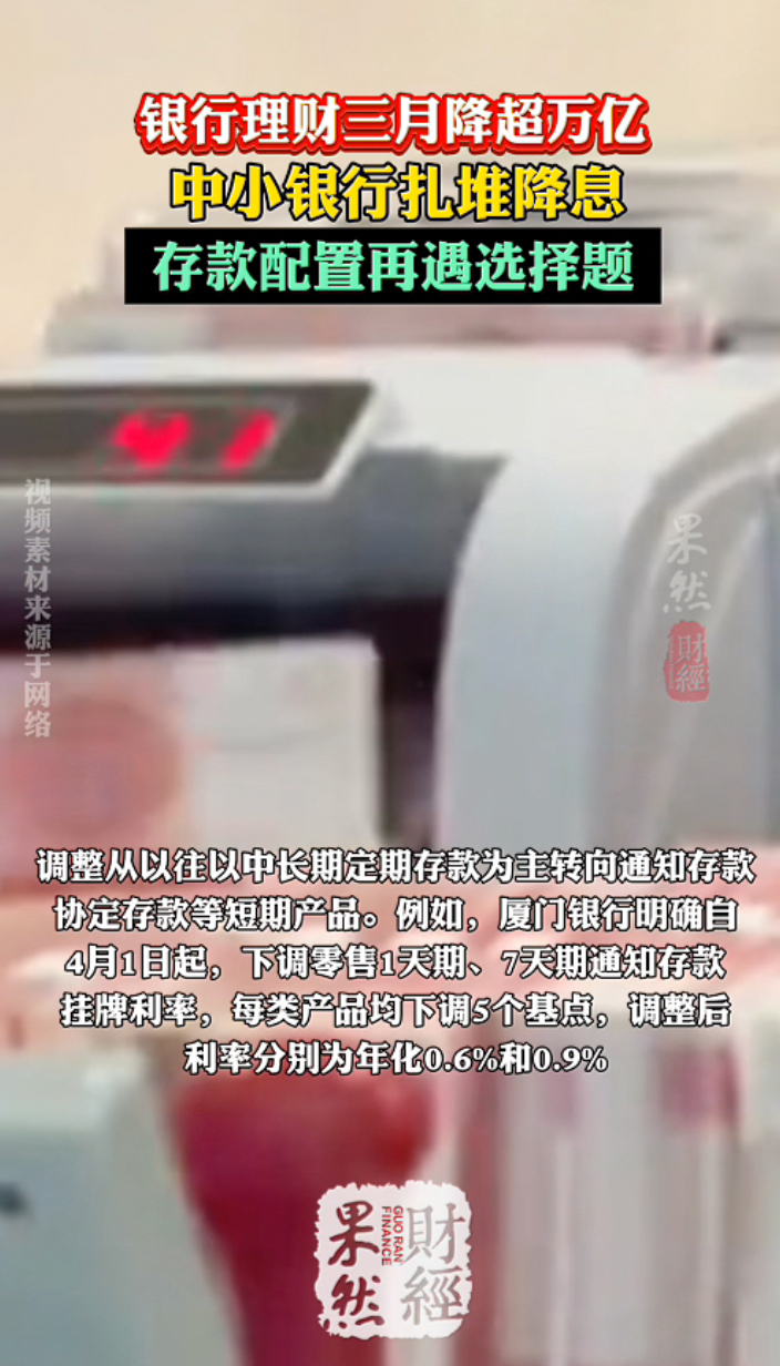 果然财经|银行理财三月降超万亿,中小银行扎堆降息 18:08 原创齐鲁晚报·齐鲁壹点客户端 微信扫码扫码下载客户端据券商中国,记者从业内渠道汇总的独家数据显示,管理规模超万亿元的14家理财公司(含6家国有行理财公司、8家股份行理财公司),3月末管理规模环比降约1.13万亿元,自2月末短暂回升后再度出现下降。此外,伴随着“开门红”时点的远去,进入4月,国内中小银行利率密集进入调整期,已有多地城商行、农商行、村镇银行宣布下调存款产品利率水平。