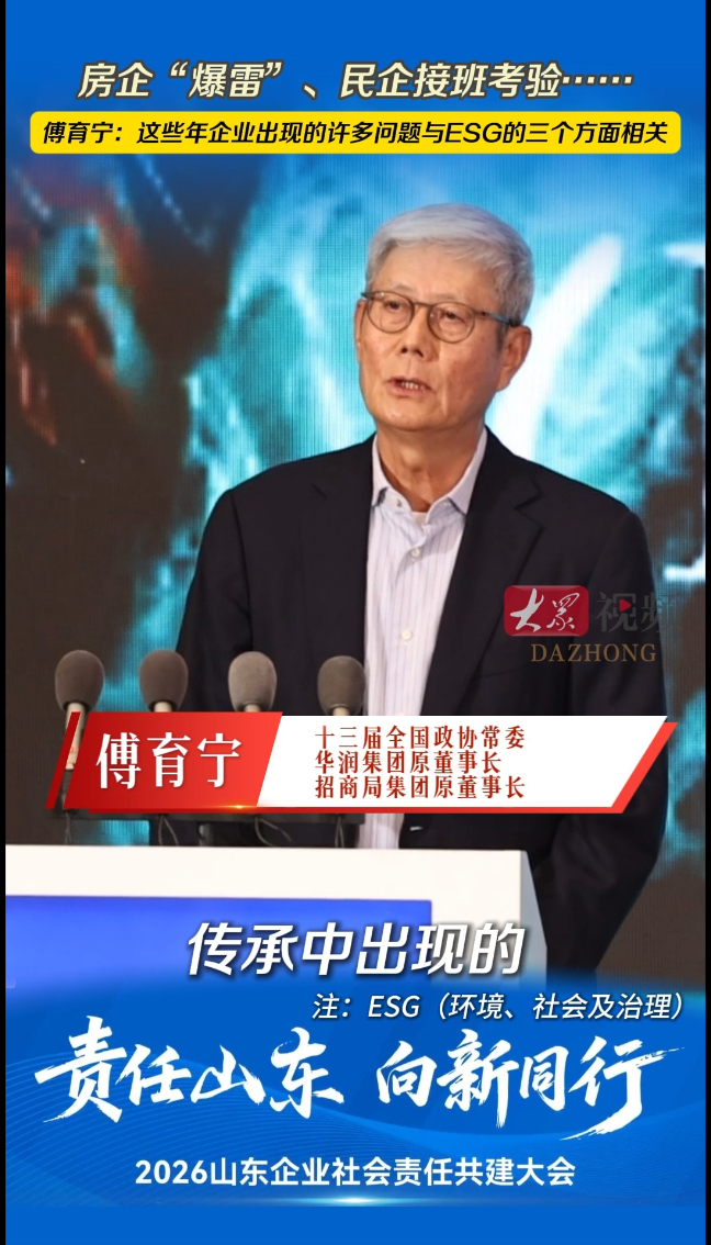 4月13日,2026山东企业社会责任共建大会在济南启幕,大会以“责任山东,向新同行”为主题,聚焦企业社会责任履行与ESG发展理念,汇聚政企学研媒多方智慧,为山东企业高质量发展树立标准、提供指引。在主旨演讲环节,十三届全国政协常委,华润集团原董事长、招商局集团原董事长傅育宁围绕企业公民“道德仁义礼” 的核心内核,分享了ESG对于企业高质量发展的重要意义与实践价值。(大众新闻记者 申家鑫 李钦鑫 谢巨洋)
