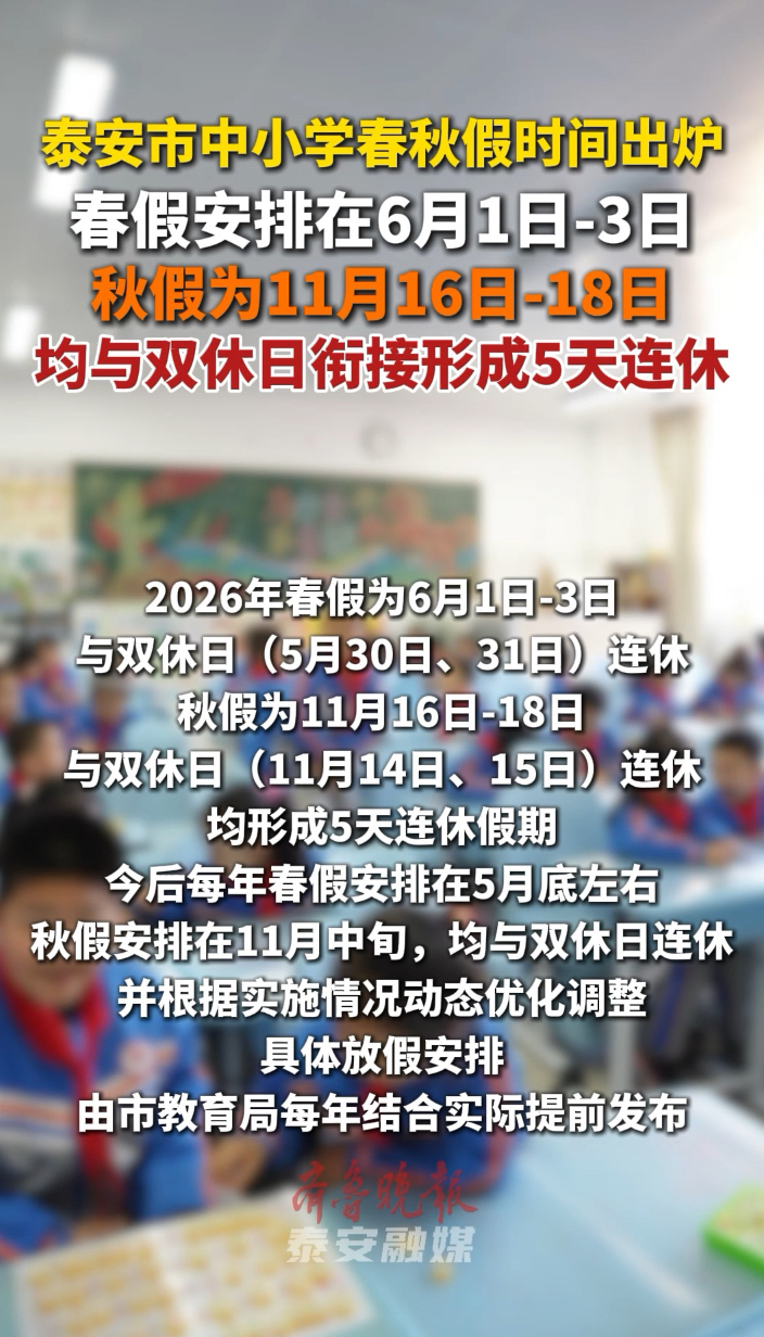 果然视频丨泰安市中小学春秋假出炉!春假时间安排在6月1日—3日,秋假为11月16日-18日,均与双休衔接形成5天连休齐鲁晚报·齐鲁壹点客户端 21:23原创据泰安市教育局官方微信消息。2026年春假为6月1日-3日,与双休日(5月30日、31日)连休;秋假为11月16日-18日,与双休日(11月14日、15日)连休,均形成5天连休假期。今后每年春假安排在5月底左右,秋假安排在11月中旬,均与双休日连休,并根据实施情况动态优化调整。具体放假安排,由市教育局每年结合实际提前发布。