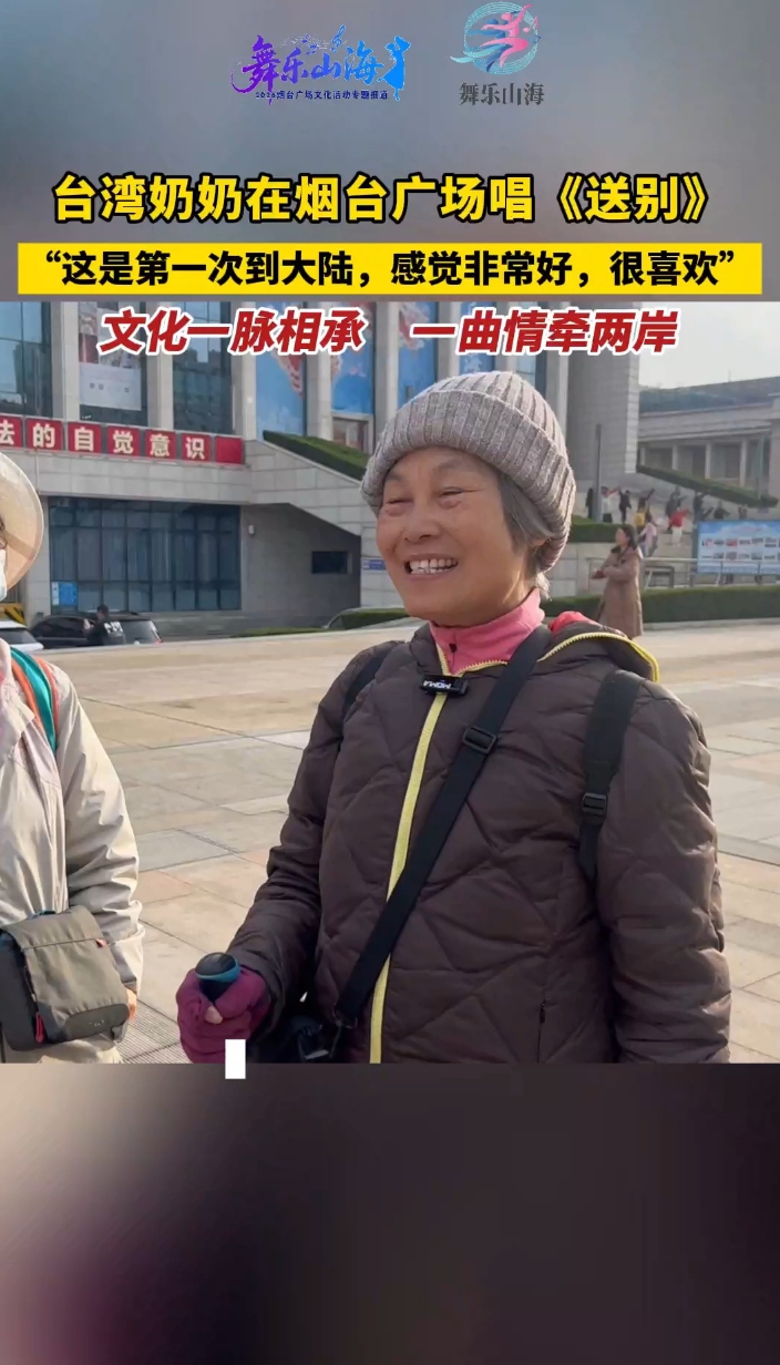 果然视频|一曲情牵两岸,台湾奶奶在烟台广场唱《送别》齐鲁晚报·齐鲁壹点客户端 09:02原创66岁的中国台湾奶奶林洁怡第一次到大陆旅游:感觉非常好,很喜欢!4月11日,舞乐山海 “一起来唱歌吧” 广场培训在烟台文化中心广场举行,专业老师现场教学。广场上响起的一曲《送别》让她放开歌喉,不由自主跟唱,点赞烟台浓郁的文化氛围。(齐鲁晚报·齐鲁壹点 于洋 秦雪丽)