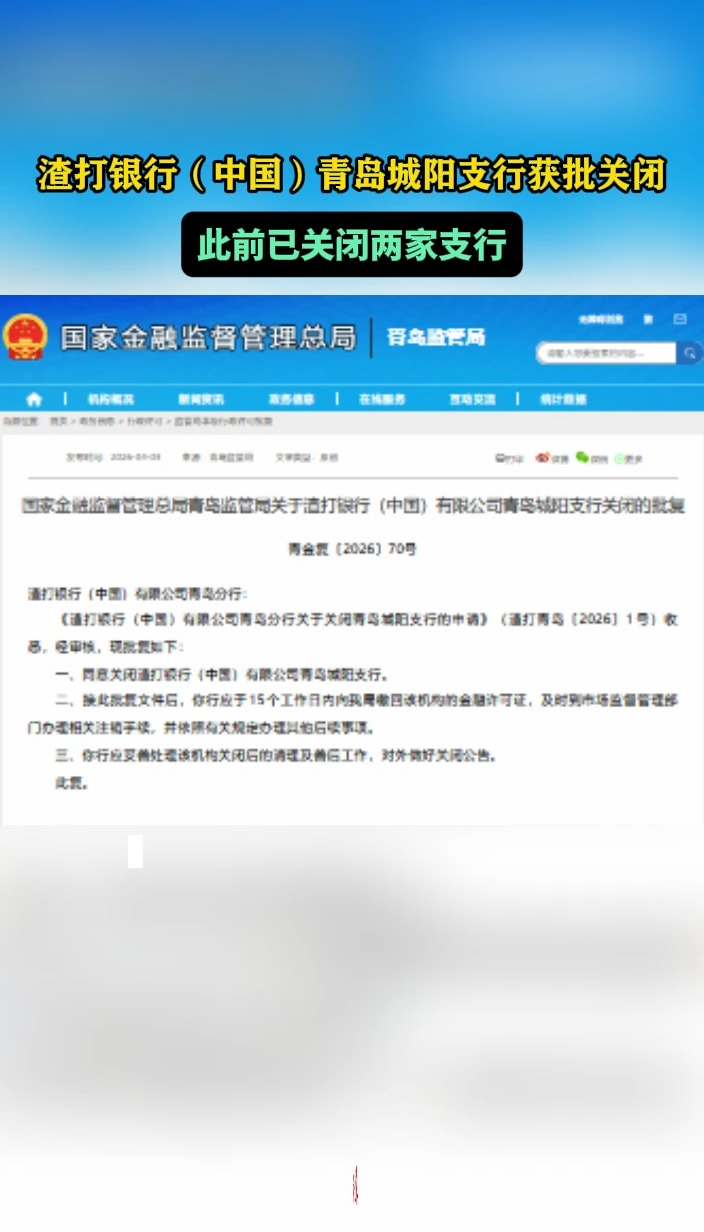 果然视频丨渣打银行(中国)青岛城阳支行获批关闭齐鲁晚报·齐鲁壹点客户端 10:36原创日前,国家金融监督管理总局青岛监管局官网公示的行政许可信息(青金复〔2026〕70号)显示,经审核,该局同意关闭渣打银行(中国)有限公司青岛城阳支行。该批复还显示,接此批复文件后,渣打银行(中国)有限公司青岛分行应于15个工作日内向该局缴回该机构的金融许可证,及时到市场监督管理部门办理相关注销手续,并依照有关规定办理其他后续事项。(齐鲁晚报·齐鲁壹点记者 尚青龙)
