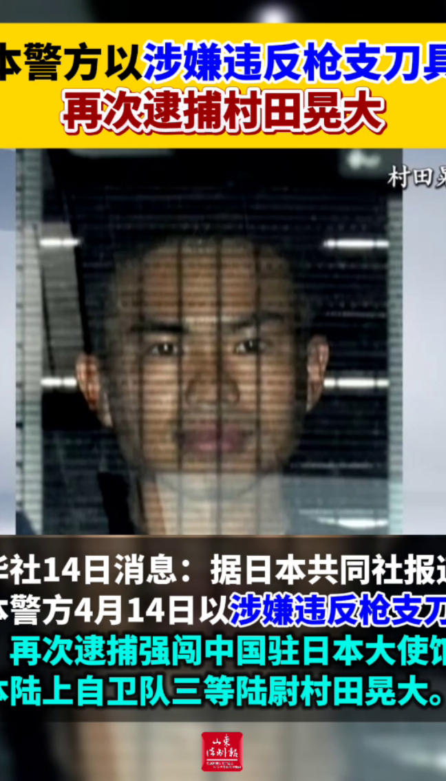 日本警方以涉嫌违反枪支刀具法再次逮捕村田晃大 16:03 大众新闻·山东法制报 微信扫码扫码下载客户端新华社14日消息:据日本共同社报道,日本警方4月14日以涉嫌违反枪支刀具法,再次逮捕强闯中国驻日本大使馆的日本陆上自卫队三等陆尉村田晃大。3月24日,日本陆上自卫队三等陆尉村田晃大携刀翻墙强行闯入中国驻日本大使馆。闯馆事件令人震惊,性质和影响极为恶劣。日本警方之前已以涉嫌非法侵入建筑物将其逮捕。