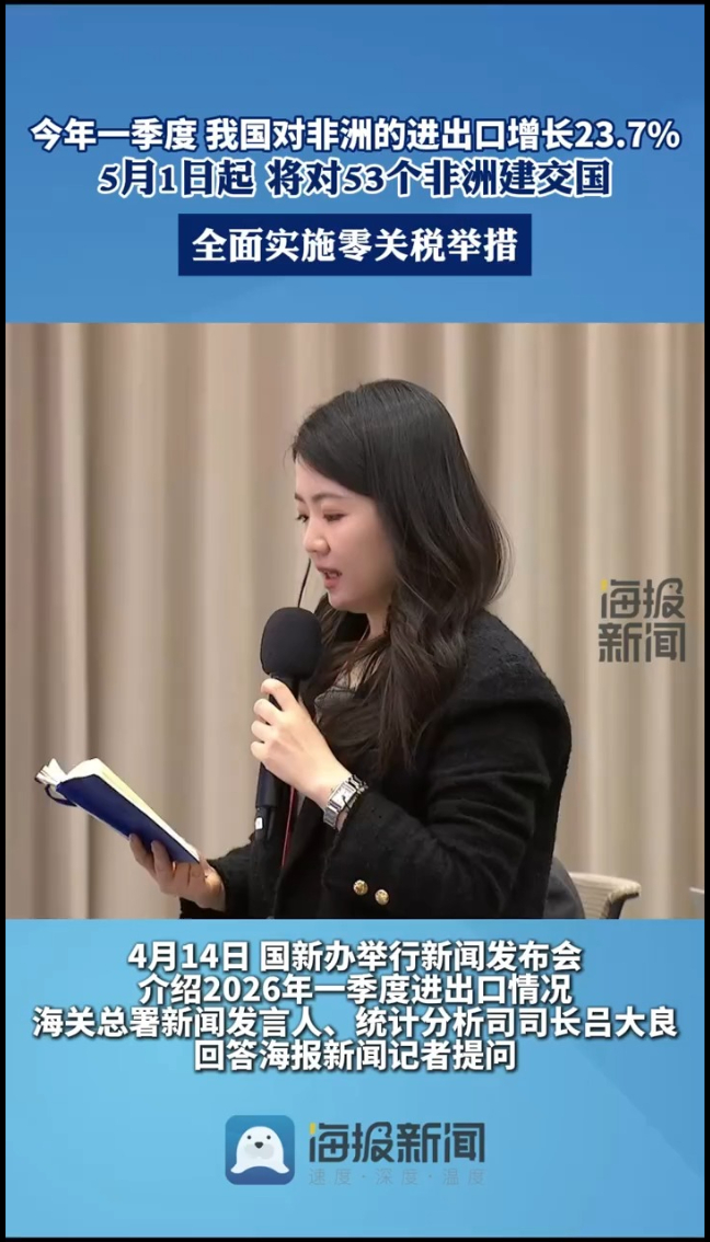 “今年是中非开启外交关系70周年,70年来,中非经贸合作规模稳步扩大,合作领域也在不断拓宽。2000年中非合作论坛成立,为中非友好合作提供了重要平台,推动双方贸易实现快速发展。我国对非洲的进出口由2000年的873.8亿元增长到2025年的2.49万亿元,也就是说从百亿的量级攀升到万亿量级,增长了27.5倍,年均增长14.3%。”吕大良介绍,今年一季度,我国对非洲的进出口是6465.6亿元,增长23.7%,中非贸易持续活跃。