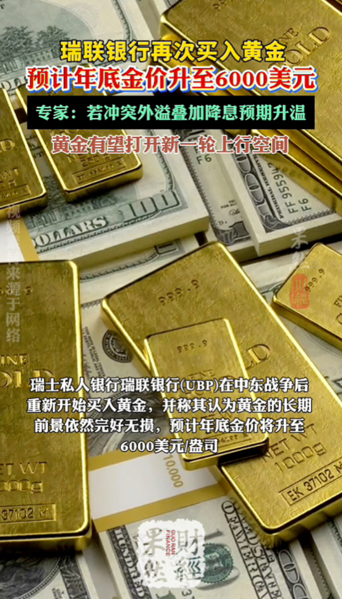果然财经|瑞联银行再次买入黄金,预计年底金价升至6000美元 14:26 原创齐鲁晚报·齐鲁壹点客户端 微信扫码扫码下载客户端据中新经纬,瑞士私人银行瑞联银行(UBP)在中东战争后重新开始买入黄金,并称其认为黄金的长期前景依然完好无损,预计年底金价将升至6000美元/盎司。据这家瑞士私人银行最新透露,正在逐步将黄金重新纳入全权委托客户的投资组合。该行此前将黄金敞口从约10%削减至3%,目前已恢复至约6%。