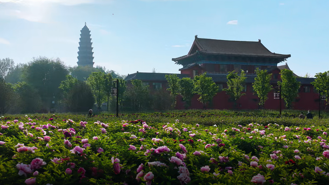 汶上思圣园,牡丹花开正盛,芍药也次第绽放,千年古塔前,尽是春日好风光。
