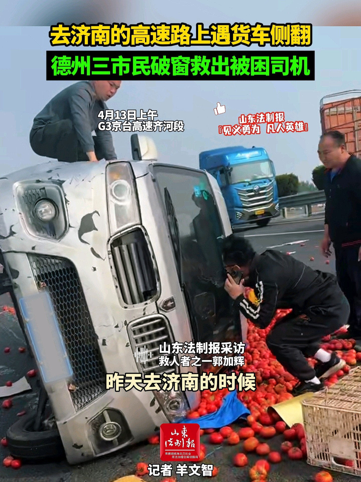 去济南的高速上遇货车侧翻,德州三市民破窗救出被困司机 昨天21:57 现场山东法制报 微信扫码扫码下载客户端4月13日上午,G3京台高速齐河段一辆货车因车辆爆胎发生侧翻,由德州齐河去济南工作的郭加辉、王兆林、刘军开车经过发现后,果断靠边停车,破窗救人,随后与其他赶来帮忙的市民一起将货车扶正。(大众新闻·山东法制报记者 羊文智)