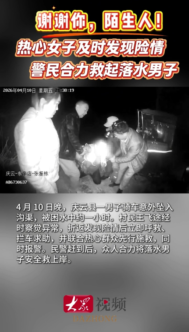谢谢你陌生人!沟渠惊魂一小时,庆云好心人合力托举生命 16:50 原创大众新闻 微信扫码扫码下载客户端4月10日晚,庆云县一男子骑车意外坠入沟渠,被困水中约一小时。女子王飞途经时察觉异常,折返发现险情后立即呼救、拦车求助,并联合热心群众先行施救,同时报警。民警赶到后,众人合力将落水男子安全救上岸。(大众新闻记者 贺莹莹 通讯员 马云波)