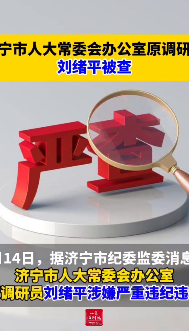 济宁市人大常委会办公室原调研员刘绪平被查 15:44 大众新闻·山东法制报 微信扫码扫码下载客户端4月14日,据济宁市纪委监委消息:济宁市人大常委会办公室原调研员刘绪平涉嫌严重违纪违法,目前正接受济宁市纪委监委纪律审查和监察调查。