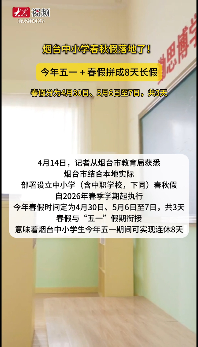 烟台中小学春假时间定了!今年五一+春假拼成8天长假 16:53 原创大众新闻 微信扫码扫码下载客户端4月14日,记者从烟台市教育局获悉,烟台市结合本地实际,部署设立中小学(含中职学校,下同)春秋假,自2026年春季学期起执行。今年春假时间定为4月30日、5月6日至7日,共3天。春假与“五一”假期衔接,意味着烟台中小学生今年五一期间可实现连休8天。(大众新闻记者 董卿 邢金钰)