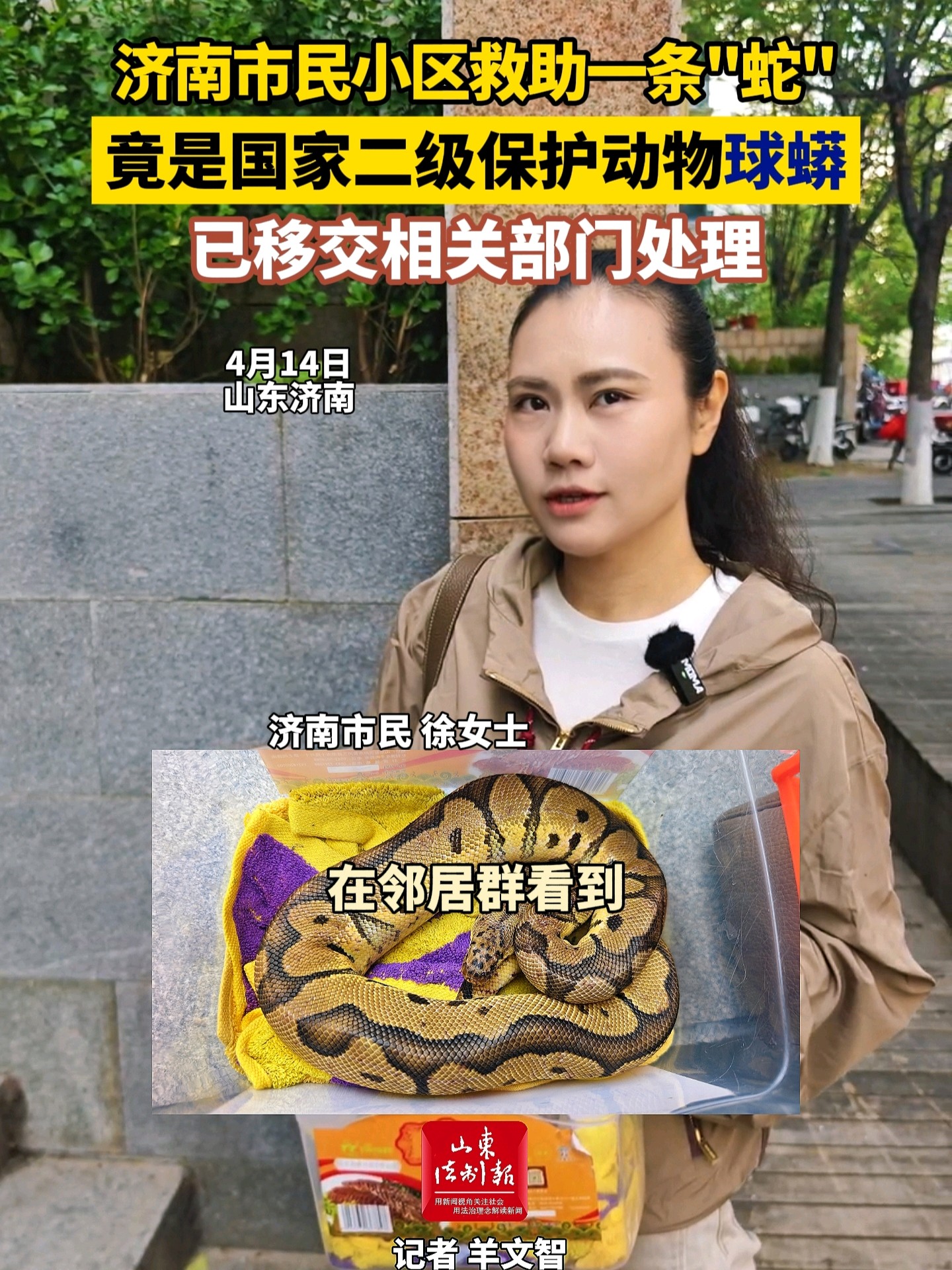 济南市民小区救助一条“蛇”,竟是国家二级保护动物球蟒,已移交相关部门处理 昨天21:55 现场山东法制报 微信扫码扫码下载客户端济南市民徐女士近日在小区捡到一条蛇,通过上网查询后,得知这条蛇竟是国家二级保护动物球蟒,徐女士紧接着拨打了12345说明情况,并在随后几天细心照料。4月14日,济南野生动物世界工作人员到场完成交接。(大众新闻·山东法制报记者 羊文智)