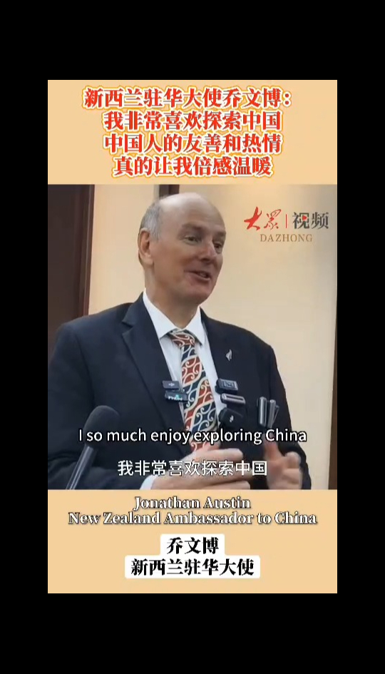 新西兰大使乔文博:我非常喜欢探索中国,中国人的友善和热情,真的让我倍感温暖大众新闻 17:11现场“新西兰是中国经济崛起的重要受益者。中新两国稳定、平衡且互利共赢的关系,不仅造福两国人民,也为地区与世界注入更多确定性。”日前,乔文博大使在接受大众新闻记者采访时说,中国人民的友善热情也让他倍感温暖,尽管不会中文,需借助翻译软件沟通,但仍能深切感受到民众的乐于助人。(大众新闻记者 董婉婉 刘玉凡 实习生 张子瑜 陈诗怡)