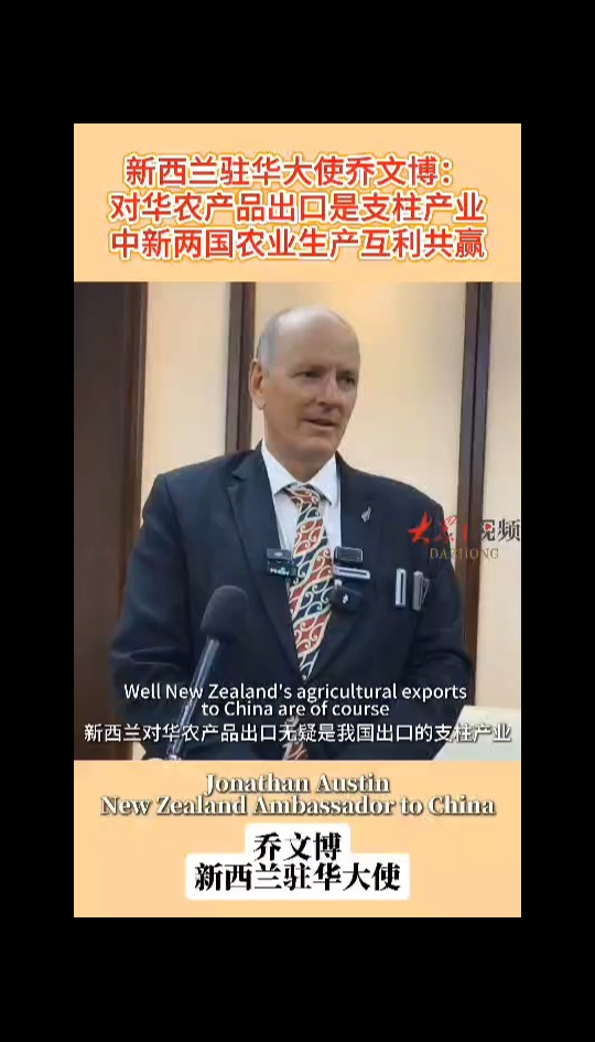 新西兰大使乔文博:对华农产品出口是新西兰支柱产业,中新两国农业生产互利共赢大众新闻 17:12现场“新西兰对中国农产品出口无疑是我国出口贸易的支柱产业,中国消费者对新西兰优质、安全的农产品也有着高度认可。”日前,乔文博大使在接受大众新闻记者采访时说,这些优质产品的产出,离不开新西兰多年来在农业技术、植物及作物育种领域的持续投入,堪称高科技农业发展的典范。(大众新闻记者 董婉婉 刘玉凡 实习生 张子瑜 陈诗怡)