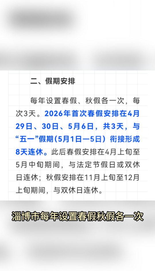 俺们淄博|淄博公布春假安排,连休8天 17:09 原创大众新闻·鲁中晨报 微信扫码扫码下载客户端近日,淄博市正式出台中小学春秋假期实施方案,全面落实春秋假制度。每年设置春假、秋假各一次,每次3天。2026年首次春假安排在4月29日、30日、5月6日,共3天,与“五一”假期(5月1日—5日)衔接形成8天连休。此后春假安排在4月上旬至5月中旬期间,与法定节假日或双休日连休;秋假安排在11月上旬至12月上旬期间,与双休日连休。 (大众新闻·鲁中晨报记者 伊巍 孙渤海)