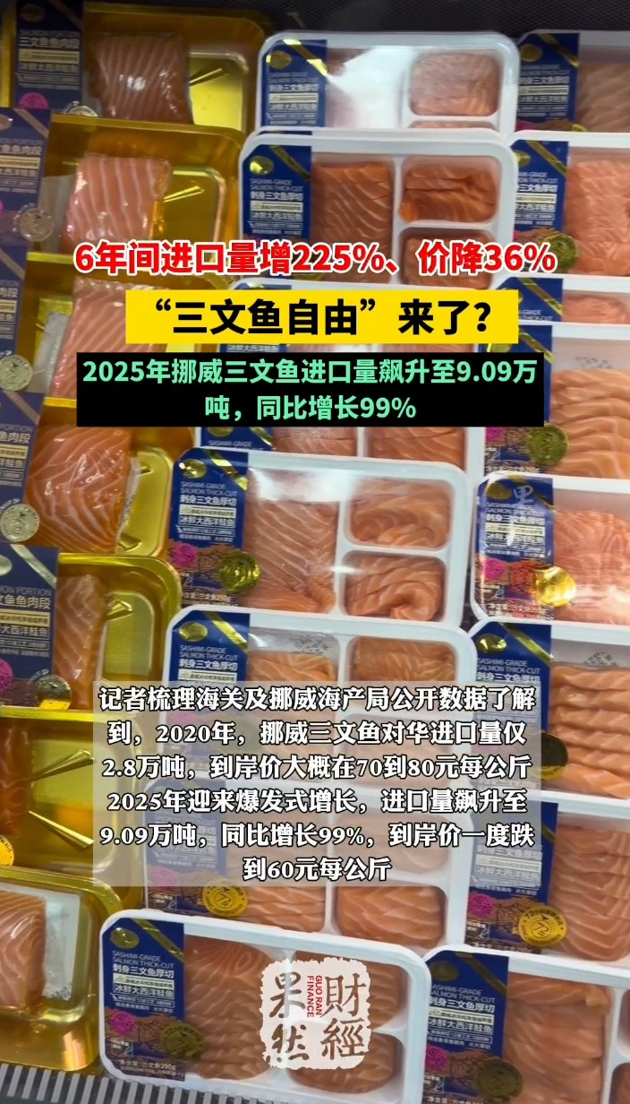 果然财经|进口量暴增,国产养殖崛起,“三文鱼自由”实现了吗? 17:00 原创齐鲁晚报·齐鲁壹点客户端 微信扫码扫码下载客户端记者梳理海关及挪威海产局公开数据了解到,2020年,挪威三文鱼对华进口量仅2.8万吨,到岸价大概在70到80元每公斤;2025年迎来爆发式增长,进口量飙升至9.09万吨,同比增长99%,到岸价一度跌到60元每公斤。