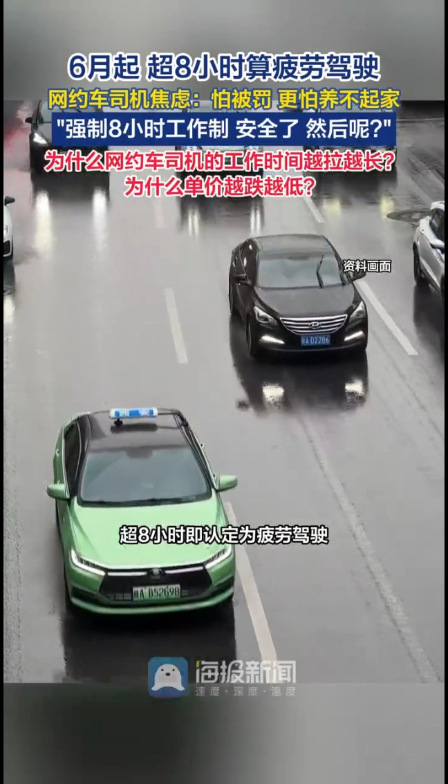 6月起,客运机动车驾驶人24小时内超8小时即认定为疲劳驾驶,依靠车载监控、行驶轨迹从严查处,守护司乘出行安全,初衷十分善意。但网约车司机直言:怕被罚,更怕养不起家。“单价跌、人数涨、订单少,只能拿命换时间”。