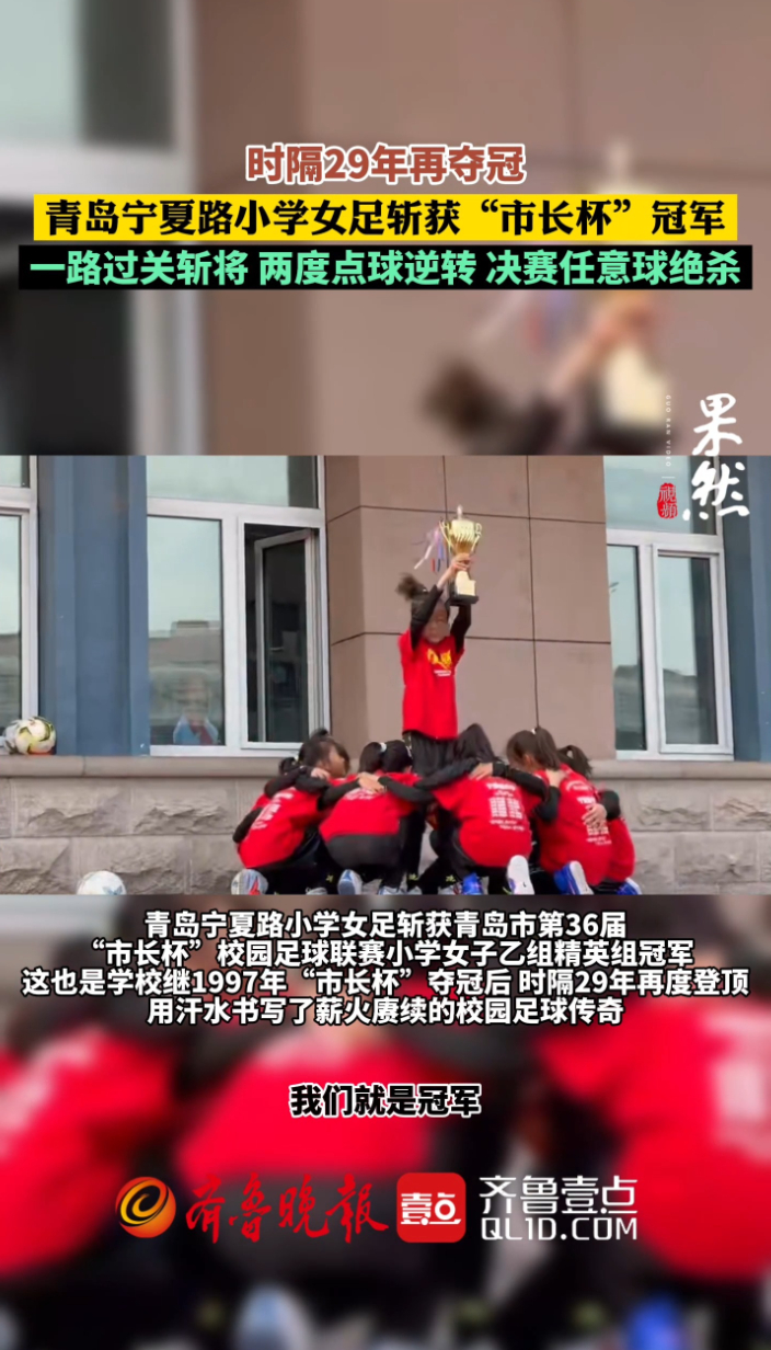 果然视频丨宁夏路小学女足斩获青岛“市长杯”精英组冠军齐鲁晚报·齐鲁壹点客户端 18:54原创4月11日,青岛市第36届“市长杯”校园足球联赛小学女子乙组精英组赛事圆满落幕。青岛宁夏路小学女子足球队一路披荆斩棘、奋勇拼搏,强势斩获赛事冠军。跨越29年岁月轮回,从1997年第八届“市长杯”首度问鼎,到2026年再度登顶,一代又一代宁小女足少年接续奋斗,用汗水书写属于宁夏路小学的足球传奇! (齐鲁晚报·齐鲁壹点记者 赵波 实习生 王颖馨)