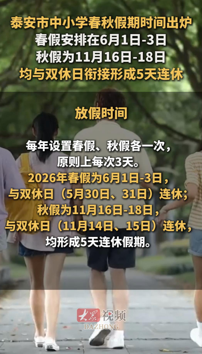 4月13日,泰安市教育局正式发文,设立中小学春秋假期。放假范围为泰安市普通小学各年级、初中非毕业年级、中职非毕业年级。每年设置春假、秋假各一次,原则上每次3天。2026年春假为6月1日-3日,与双休日(5月30日、31日)连休;秋假为11月16日-18日,与双休日(11月14日、15日)连休,均形成5天连休假期。今后每年春假安排在5月底左右,秋假安排在11月中旬,均与双休日连休,并根据实施情况动态优化调整。