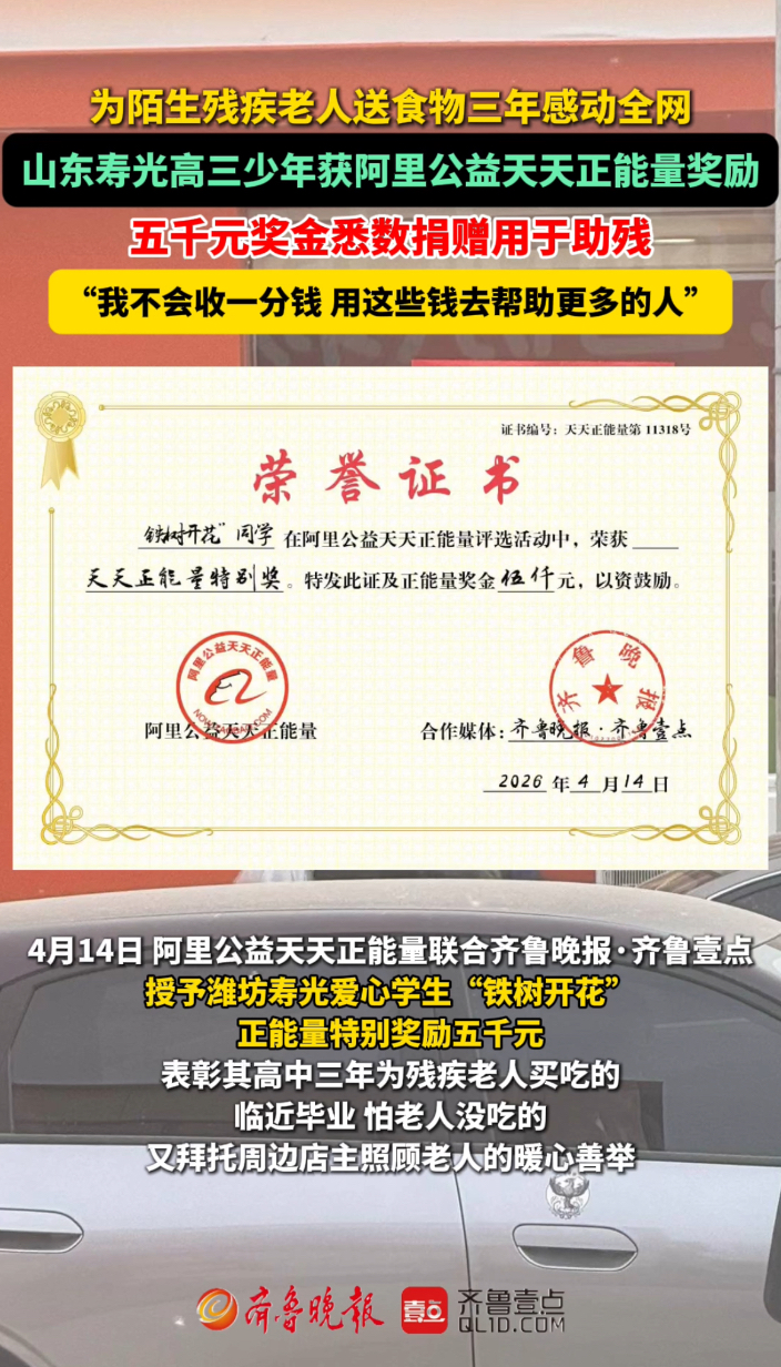 果然视频|为残疾老人送食物的高三少年获阿里公益天天正能量奖励大众报业·齐鲁壹点 昨天22:434月14日,阿里公益天天正能量联合齐鲁晚报·齐鲁壹点,授予潍坊寿光爱心学生“铁树开花”正能量特别奖励五千元。在得知这个消息后,还是高中生的他表示,“不会收一分钱”,并选择将五千元奖励直接捐给山东省残疾人福利基金会,用于残疾人疾病救治,“去帮助更多的人”。 齐鲁晚报·齐鲁壹点 田思敏