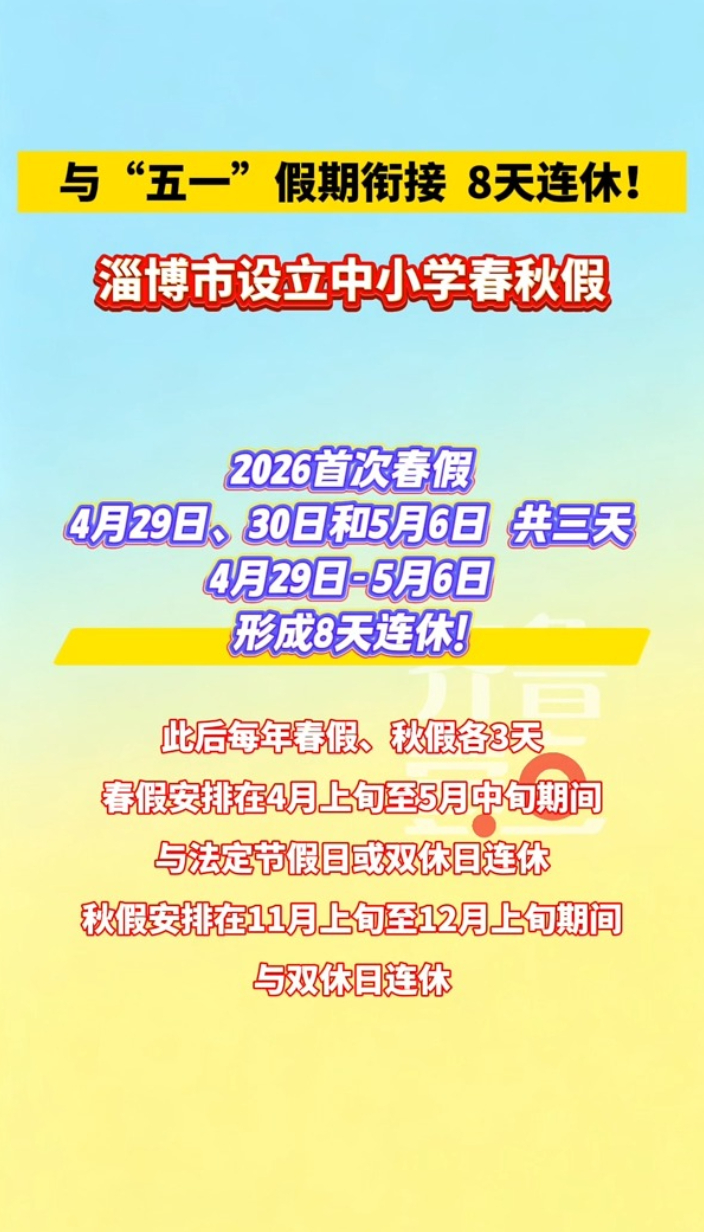 淄博市设立中小学春秋假,2026年首次春假时间定了大众报业·齐鲁壹点 08:51淄博市中小学春秋假期时间公布!每年设置春假、秋假各一次,每次3天。2026年首次春假安排在4月29日、30日、5月6日,共3天,与“五一”假期(5月1日—5日)衔接形成8天连休。此后春假安排在4月上旬至5月中旬期间,与法定节假日或双休日连休;秋假安排在11月上旬至12月上旬期间,与双休日连休。