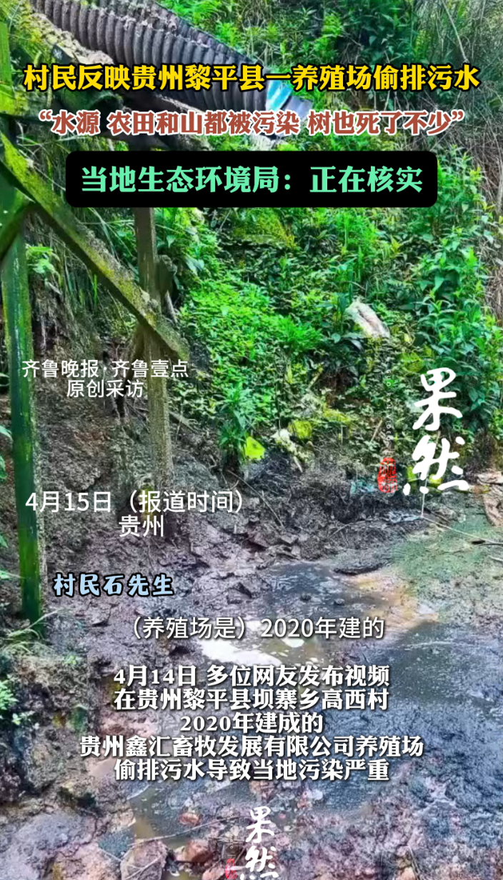 4月14日,多位网友发布视频,在贵州黎平县坝寨乡高西村,2020年建成的贵州鑫汇畜牧发展有限公司养殖场,偷排污水致当地污染严重。有村民向齐鲁晚报·齐鲁壹点反映,目前,水源、农田和山体都遭受了不同程度的污染。4月15日,记者致电黔东南州生态环境局黎平分局,工作人员表示有关情况正在核实。(爆料电话:0531-85193656;邮箱:405617016@qq.com)(齐鲁晚报·齐鲁壹点 刘志坤 杨涛)