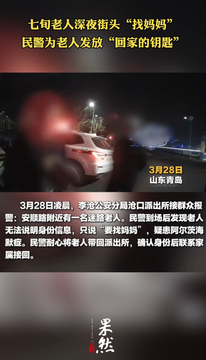 七旬老人深夜街头“找妈妈”,民警为老人发放“回家的钥匙”齐鲁晚报·齐鲁壹点客户端 昨天17:34原创3月28日凌晨,青岛市公安局李沧分局沧口派出所接群众报警:安顺路附近有一名迷路老人。民警到场后发现老人无法说明身份信息,只说“要找妈妈”,疑患阿尔茨海默症。民警耐心将老人带回派出所,确认身份后联系家属接回。