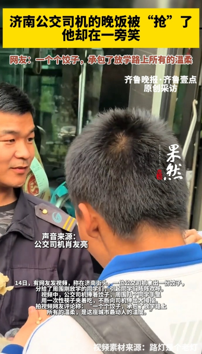 果然视频|济南公交司机的晚饭被“抢”了,他却在一旁笑齐鲁晚报·齐鲁壹点客户端 昨天18:13原创14日,有网友发视频,称在济南街头,一位公交司机拿出一份饺子,分给了周围刚放学的同学们,引起同学们阵阵欢呼。视频中,公交司机捧着饺子,周围几个同学手里用一次性筷子夹着吃,不断向司机伸出大拇指。拍视频网友评论称:“一个个饺子,承包了放学路上所有的温柔,是这座城市最动人的温度。” 齐鲁晚报·齐鲁壹点记者 袁野